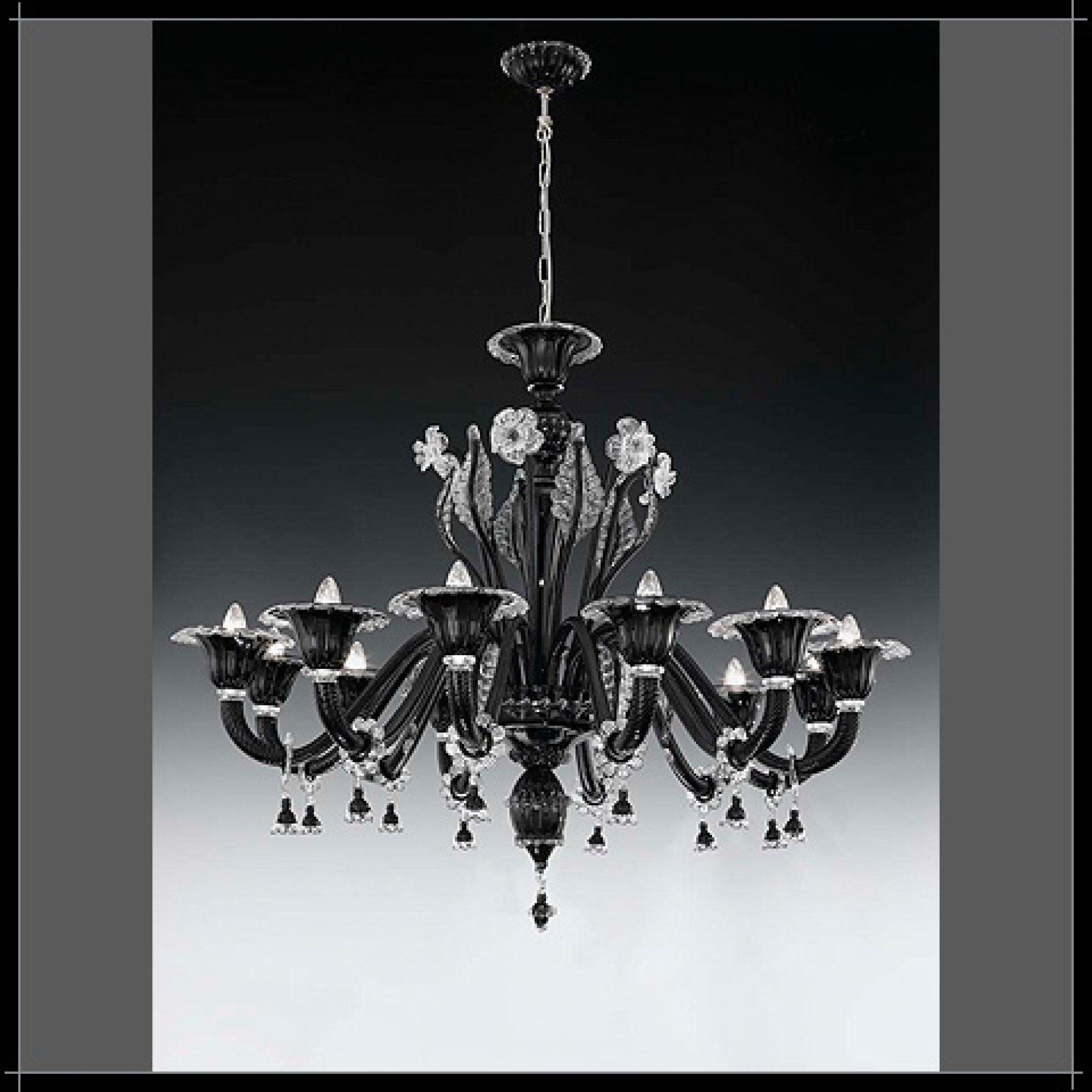 Venedik çağdaş tarzı avizeler, el yapımı üfleme camdan, nikel çerçeveli berrak kristal, lacivert, kırmızı ve siyah renklerde mevcuttur; 24 ayar altın çerçeveli kehribar ve kristal-altın yaprak renkleri mevcuttur.